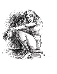 Some chick sitting on books. I dunno…